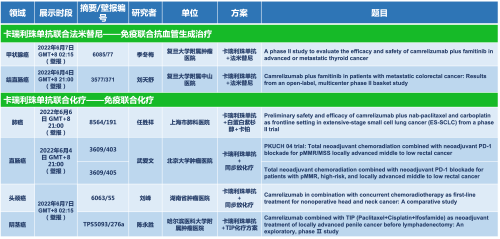 卡瑞利珠单抗联合918博天堂医药的另一款创新药法米替尼在甲状腺癌和结直肠癌领域有2项研究被接收为壁报,另有卡瑞利珠单抗联合化疗的4项研究在肺癌、结直肠癌、头颈癌和阴茎癌领域的研究被接收为5份壁报。