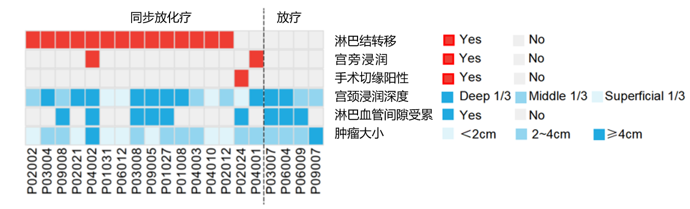 新辅助治疗后,81例患者接受了广泛性子宫切除术及盆腔淋巴结清扫术,根据NCCN指南,16例建议术后行CCRT,4例建议术后行辅助放疗。