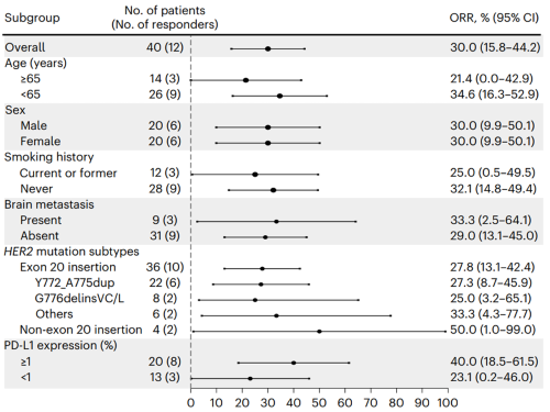 在不同的亚组中,包括脑转移和不同HER2突变亚型,均观察到吡咯替尼的疗效。有或无脑转移的患者使用吡咯替尼的临床获益相似(ORR:33.3% vs. 29.0%;中位PFS:7.0 vs. 5.6个月)。